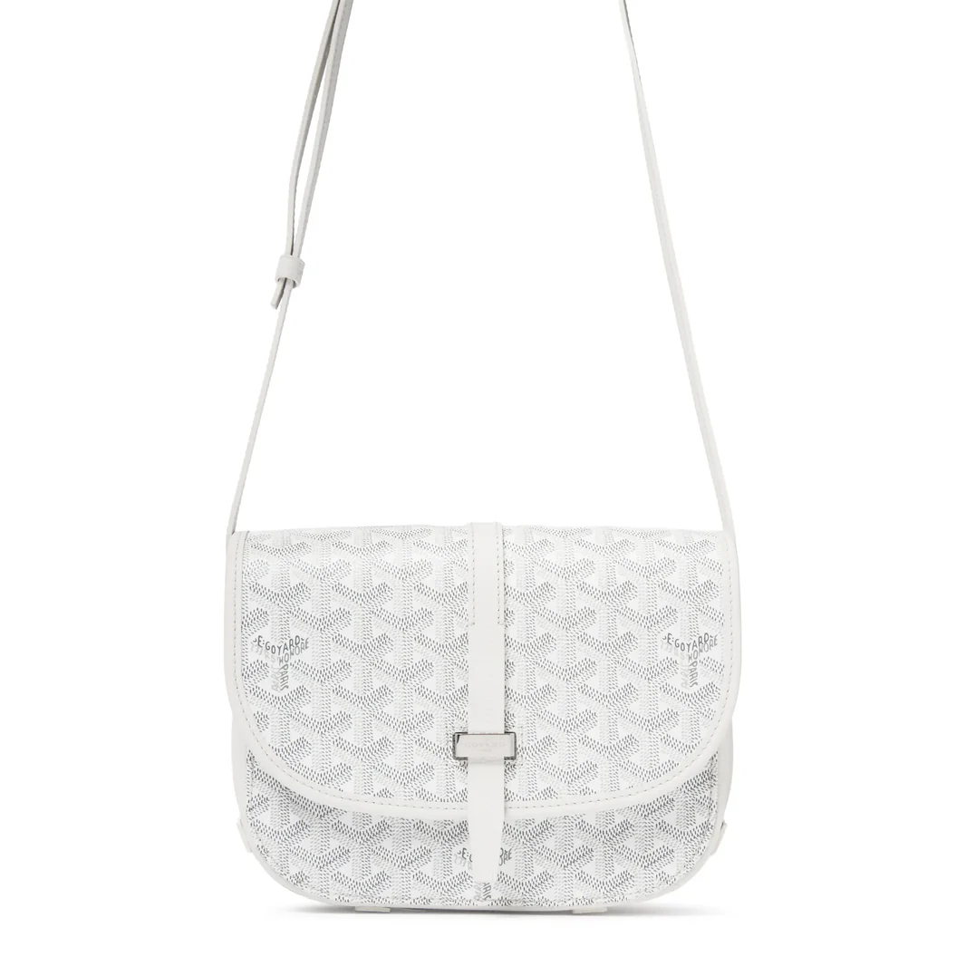 Featuring a White Goyardine-style finish, this messenger bag offers a refreshing take on a classic silhouette. Its compact structure keeps things sleek while adding a subtle statement to your look.