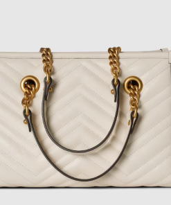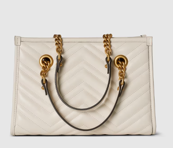 The Spring Summer 2024 collection is the latest in GG Marmont’s evolution. Presented in white matelassé leather, this roomy little tote bag is further enhanced with gold-toned hardware and the iconic Double G insignia.