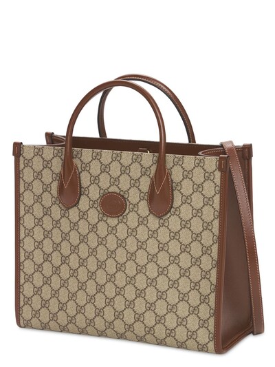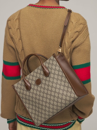 This piece is a part of Gucci Lido and was inspired by the beach clubs and summertime vibes of the Italian coast. This little tote bag, which has a top handle and shoulder strap, is made of GG Supreme canvas and has a brown leather trim. It has a structured design.