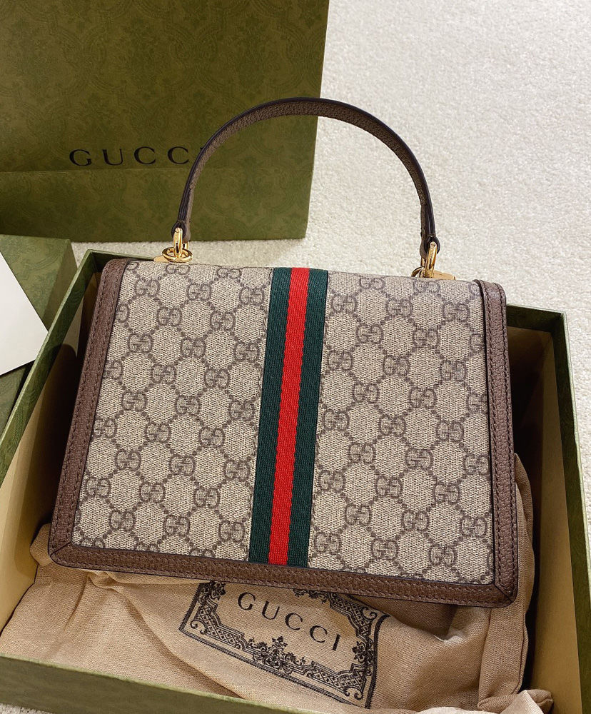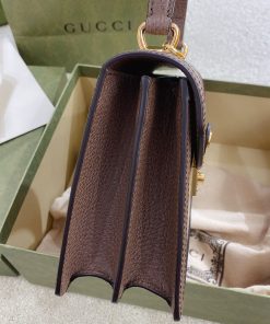 With new versions every season, the Ophidia universe keeps changing. The Epilogue line features a top handle bag with a shoulder strap that can be removed. The House Web stripe and Double G hardware, a modern interpretation of a Gucci archival belt buckle from the 1970s, highlight the square shape with a vintage feel. The style has a strong brand sense and was created using the House’s monogram canvas.