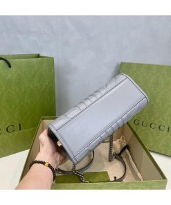 In deep grey, this is a genuine GUCCI Calfskin Matelasse Aria Mini GG Marmont Tote. The grey calfskin leather used to make this tote bag is soft and silky. This bag has silver hardware, leather top handles, and an optional shoulder strap. The top opens to reveal a beige fabric interior with patch pockets and a centre zippered compartment.